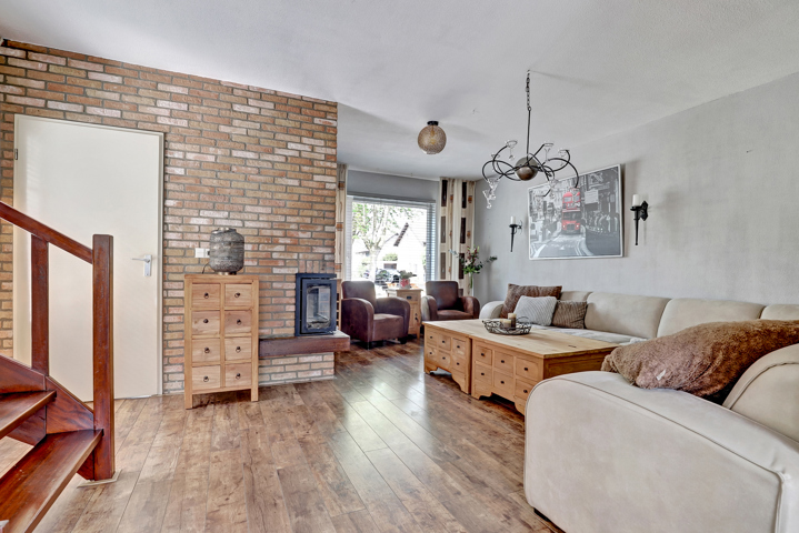 De ruime Z-vormige woonkamer van circa 40 m² is verdeeld in een zitkamer en een eetkamer en heeft veel lichtinval vanwege de grote raampartijen aan de voor- en achterzijde. De woonkamer is voorzien van een haard, de klokthermostaat en de vaste trapopgang naar de eerste verdieping.