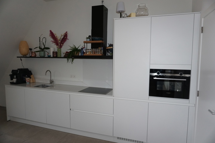 De keuken is voorzien van een keukenblok in wandopstelling, uitgerust met de volgende inbouwapparatuur: kookplaat, afzuigkap, koelkast, vaatwasser, combi-oven en een spoelbak.