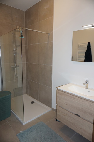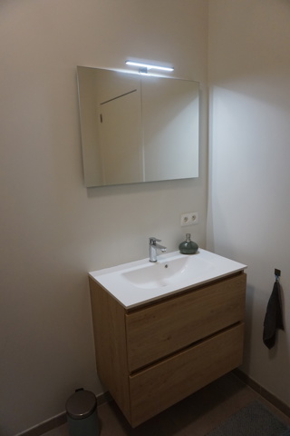 De badkamer is voorzien van een inloopdouche met regendouchekop en thermostaatkraan en een badkamermeubel met dubbele vaste wastafel.