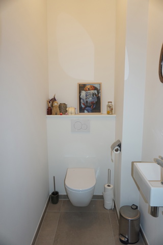 Het apart toilet is voorzien van een wandcloset en fonteintje.