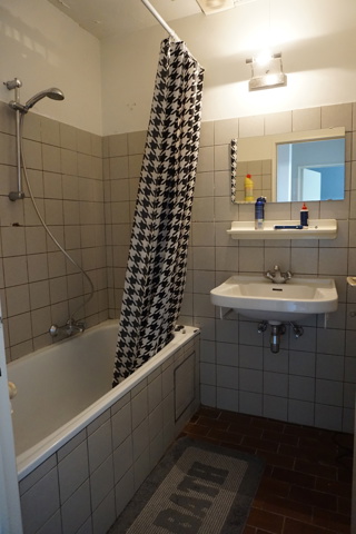 De grotendeels betegelde badkamer beschikt over een ligbad met douchegelegenheid en een vaste wastafel met spiegel en planchet.