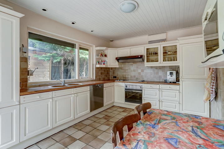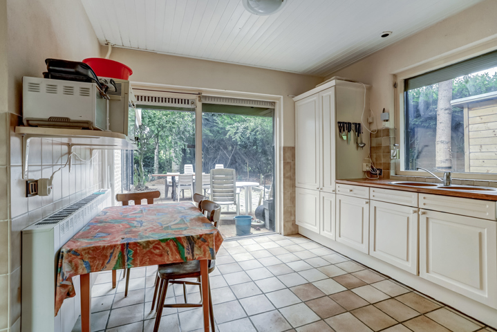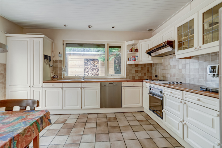 De dichte eetkeuken beschikt over een keukenblok in hoekopstelling met onder- en bovenkastjes en de volgende inbouwapparatuur: elektrische- en gaskookplaat, afzuigkap, oven, vaatwasser, koelkast, vriezer en een spoelbak. Vanuit de keuken is middels een schuifpui de achtertuin bereikbaar.