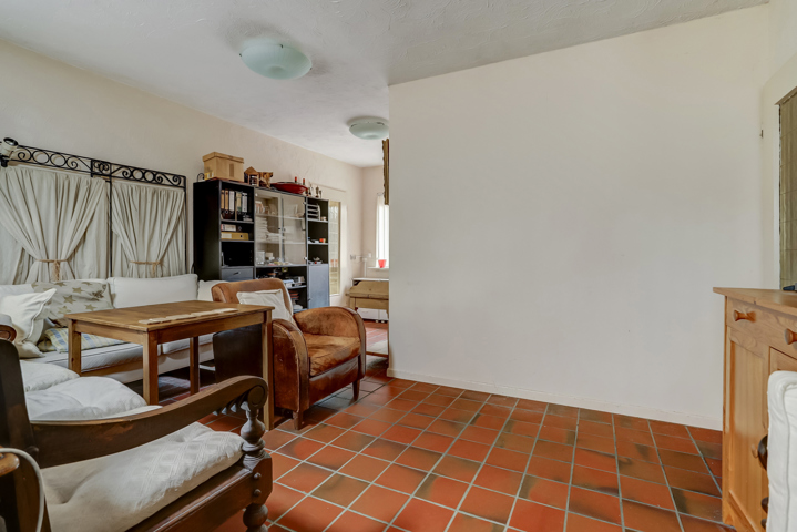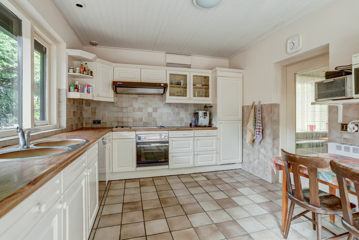 De gedeeltelijk betegelde bijkeuken is voorzien van de aansluitingen van de wasapparatuur en de achter-entree.