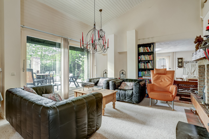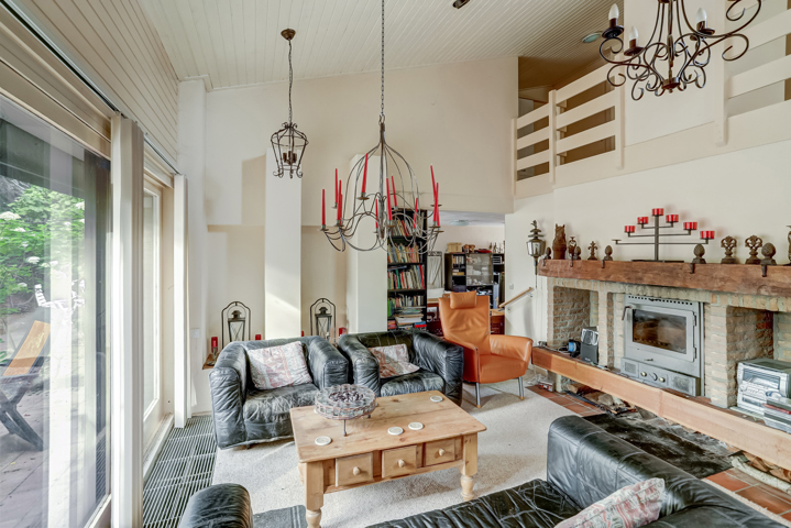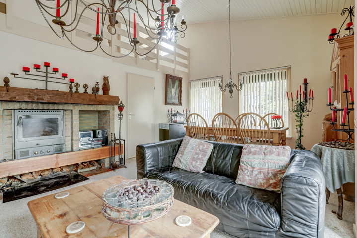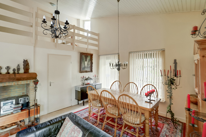 De ruime L-vormige woonkamer van ca. 59m² is verdeeld in een zitkamer en een eetkamer en heeft veel lichtinval vanwege de grote en vele raampartijen. De woonkamer, welke vanwege het hoge plafond en vide zeer ruimtelijk is, is voorzien van een houtkachel met ventilator, de thermostaat en een schuifpui naar het terras.