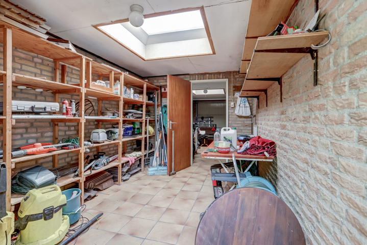 De inpandige garage van ca. 26m² is voorzien van een elektrische kantelpoort en elektra en is zeer geschikt voor een beroep of een bedrijf aan huis.