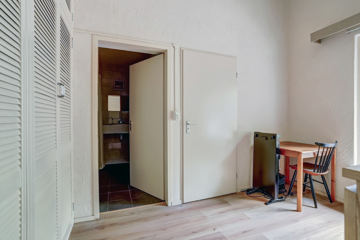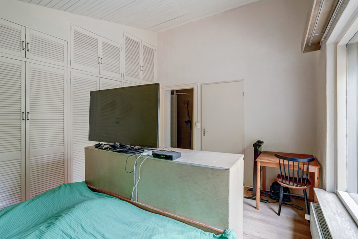 De slaapkamer van ca. 17m² is voorzien van een grote kastenwand, een tv-aansluiting en biedt rechtstreeks toegang tot de badkamer.