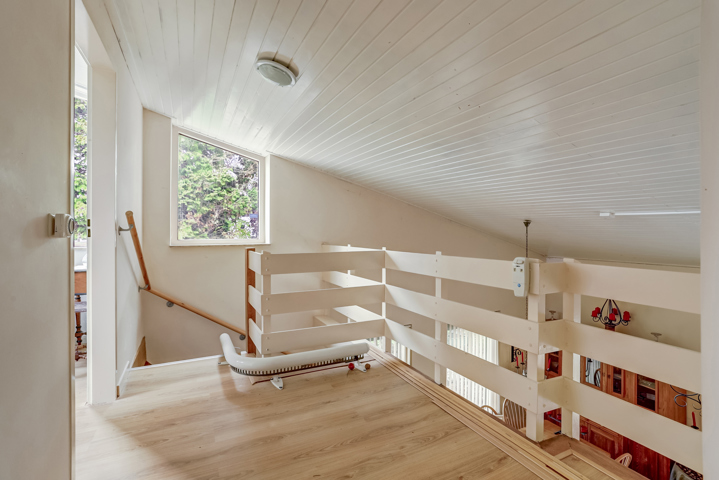 De overloop met vide op de 1e verdieping biedt toegang tot 4 slaapkamers en de 2e badkamer.