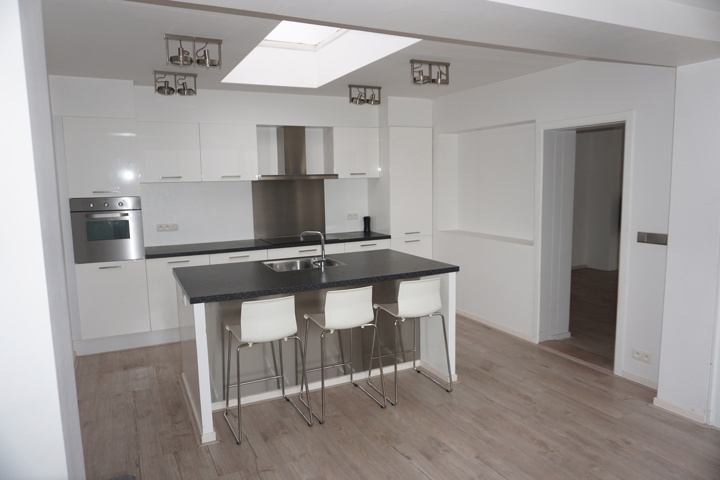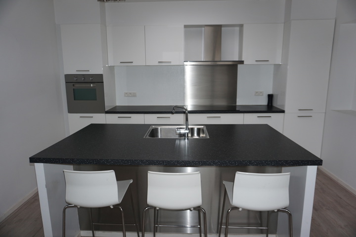 De halfopen eetkeuken (2015) van circa 25 m² beschikt over een fraai keukenblok met spoeleiland en de volgende inbouwapparatuur (inductie kookplaat, afzuigkap, vaatwasser, koelkast, vriezer, oven en 1 ½ rvs-spoelbak.