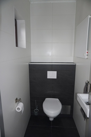 Het geheel betegelde gastentoilet (2015) is voorzien van een wandcloset, fonteintje en toiletaccessoires.