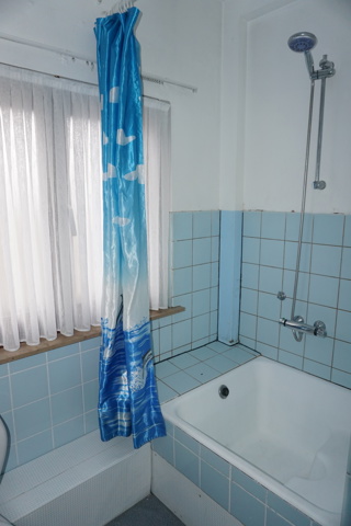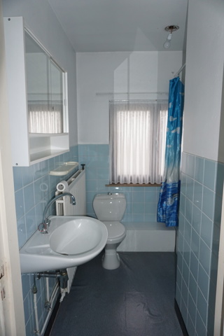 De gedeeltelijk betegelde badkamer beschikt over een zitbad met douchegelegenheid en thermostaatkraan, tweede toilet, vaste wastafel met planchet en spiegelkastje.
