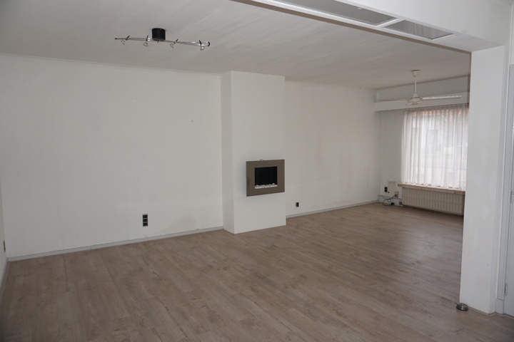 De L-vormige woonkamer heeft een oppervlakte van circa 38 m² en is voorzien van de klokthermostaat, een gelhaard en biedt toegang tot de kelder van circa 7 m² en de halfopen eetkeuken.