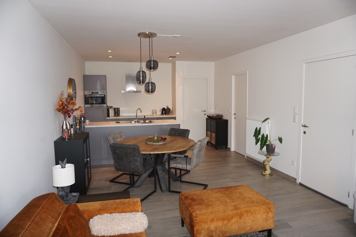 Het appartement is volledig afgewerkt met een tegelvloer, stucwerk wanden en stucwerk plafonds.