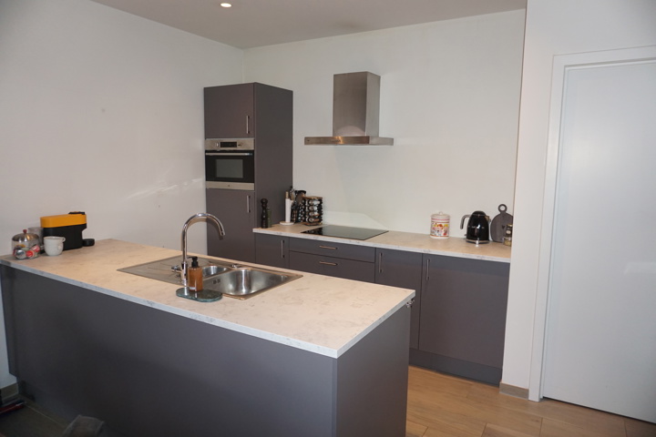 De open keuken is voorzien van een fraai keukenblok in wandopstelling met een spoeleiland en beschikt over de volgende inbouwapparatuur: inductiekookplaat, afzuigkap, combi-oven, koelkast, vaatwasser en 1 ½ rvs-spoelbak.