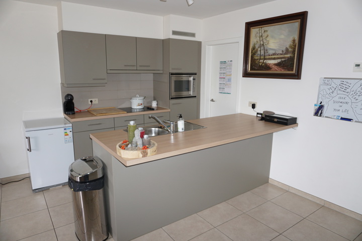 De open keuken is voorzien van een keukenblok in wandopstelling en een spoeleiland uitgerust met een keramische kookplaat, afzuigkap, koelkast, combimagnetron, vaatwasser en rvs-spoelbak.