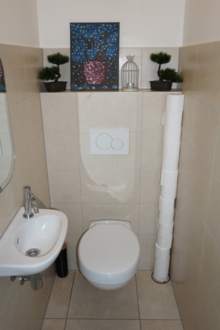 De hal/entree beschikt over een apart toilet met wandcloset, fonteintje en mechanische ventilatie.