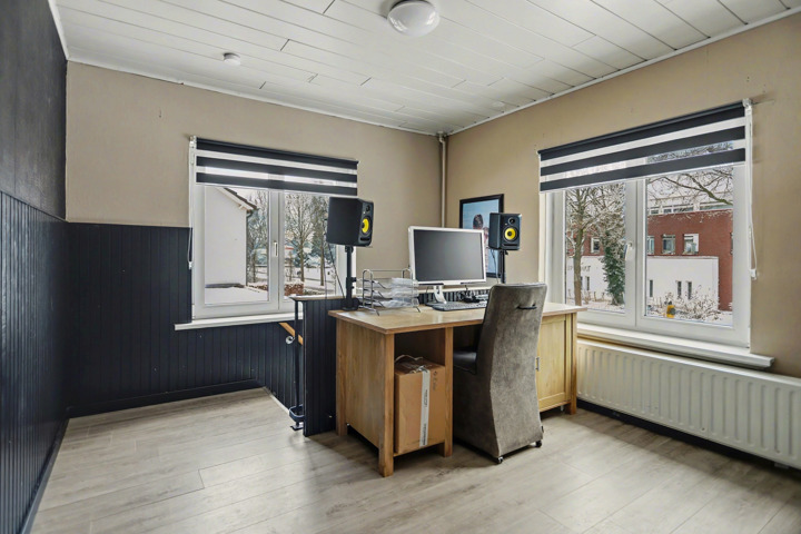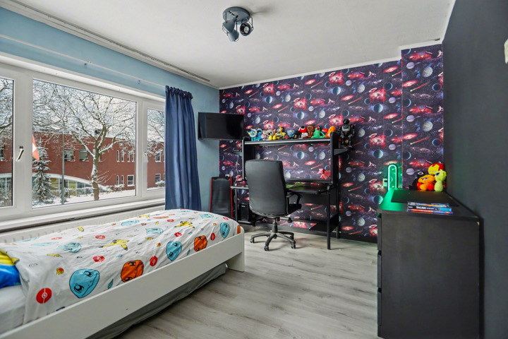 De eerste verdieping is voorzien van laminaatvloer (betonnen vloer). De overloop is vanwege de grootte uitermate geschikt om te gebruiken als een thuiswerkplek en biedt toegang tot de 3 slaapkamers en middels de vlizotrap is de bergzolder bereikbaar.