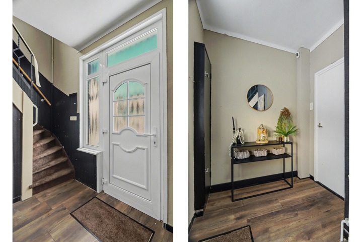 De hal/entree is voorzien van de meterkast en biedt toegang tot de open keuken en middels de vaste trapopgang naar de eerste verdieping.