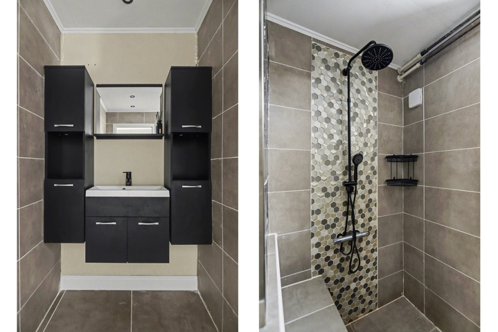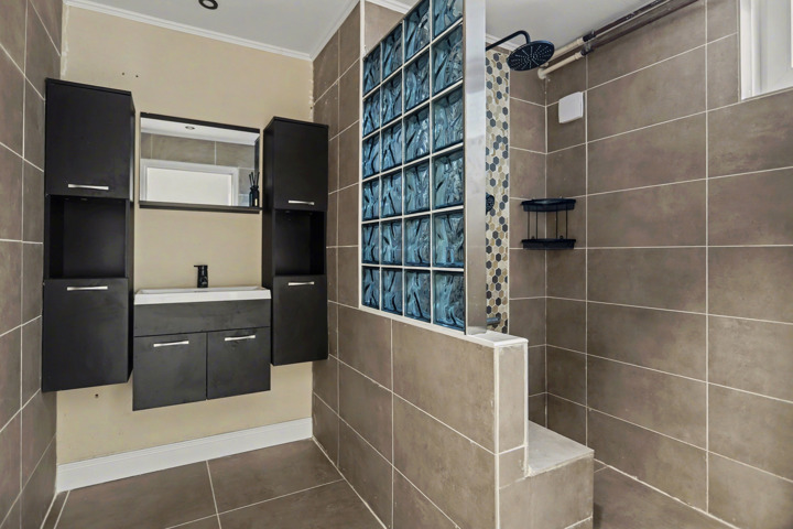 De geheel betegelde luxe badkamer is in 2024 vernieuwd en beschikt over een ruime inloopdouche met thermostaatkraan, badkamermeubel met vaste wastafel en bergkasten en ventilatie.