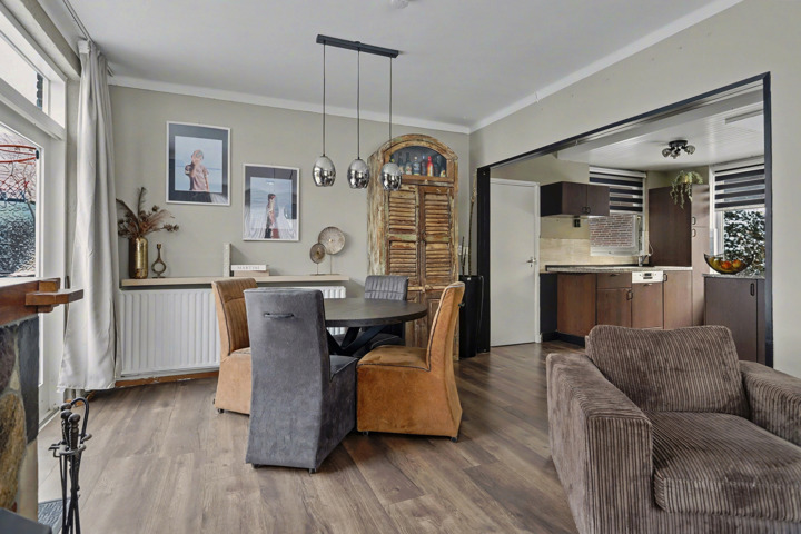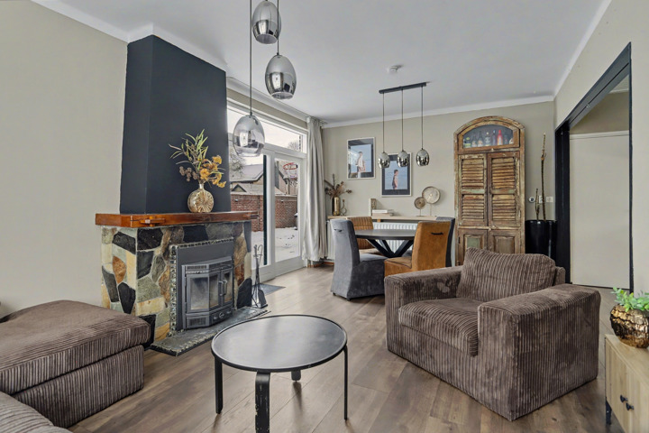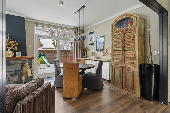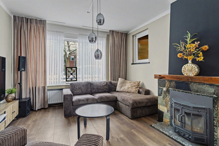 De sfeervolle L-vormige woonkamer met open keuken heeft een oppervlakte van ca. 38m² en is voorzien van een sierschouw met houtkachel, thermostaat, rolluiken en middels de schuifpui is de achtertuin toegankelijk.