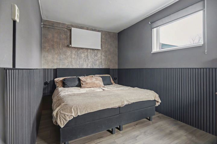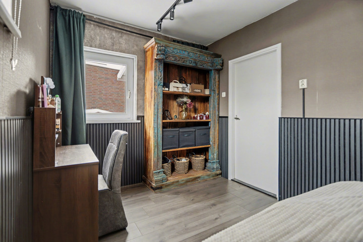 De slaapkamer van ca. 12m² is voorzien van een laminaatvloer en een loopdeur met toegang tot de achtertuin.