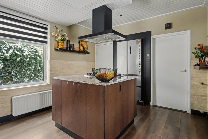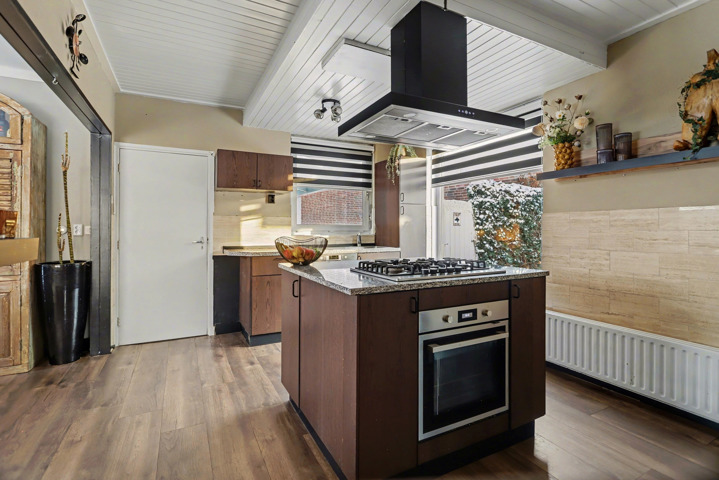 De open keuken beschikt over een zeer fraai houten keukenblok met kookeiland (2021) met een marmeren aanrechtblad en de volgende inbouwapparatuur: 5-pits gaskookplaat, afzuigkap, Amerikaanse koel-vries combi, combi-oven, vaatwasser en de spoelbak. Vanuit de keuken is de kelder te bereiken.