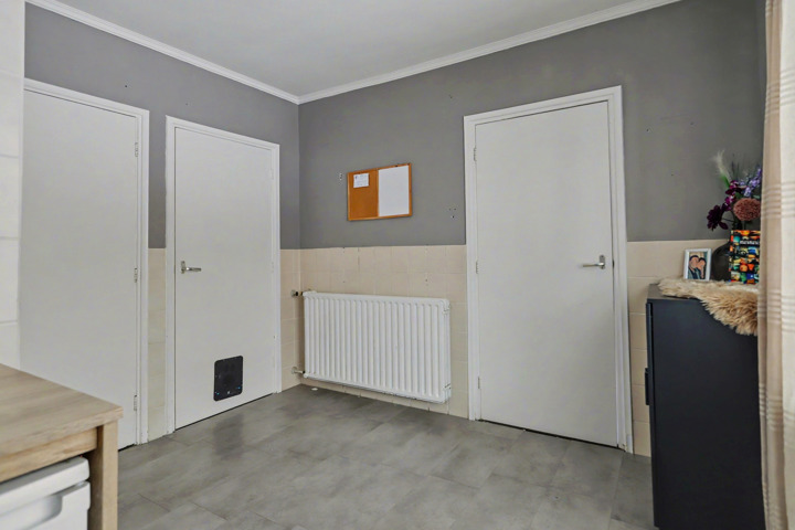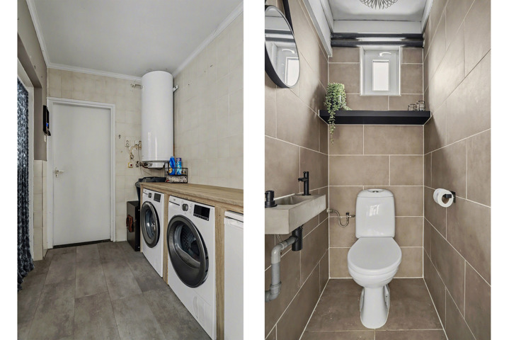 Aansluitend aan de keuken is bijkeuken gelegen voorzien van voorzien van de elektrische boiler, aansluitingen ten behoeve van de wasapparatuur en een vaste kast. Vanuit de bijkeuken zijn de slaapkamer, luxe badkamer, apart luxe toilet (2024) voorzien van een closetpot en fonteintje en de achtertuin bereikbaar.