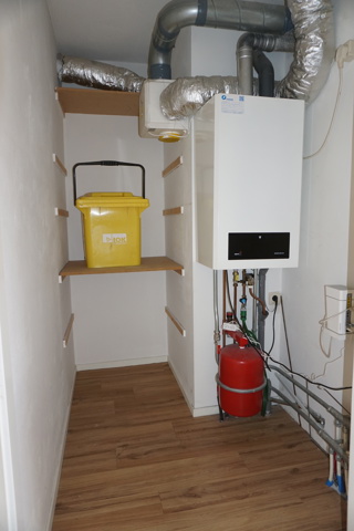 Vanuit de open keuken is de inpandige berging bereikbaar. De berging is voorzien van de opstelling van de cv-combiketel, de mechanische ventilatie unit en de groepenkast met 9 groepen en 2 aardlekschakelaars.