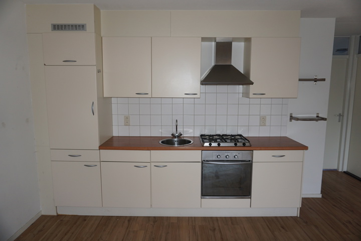 De open keuken beschikt over een keukenblok met onder- en bovenkastjes en de volgende inbouwapparatuur: 4-pits gaskookplaat, afzuigkap, vaatwasser, koelkast en oven.
