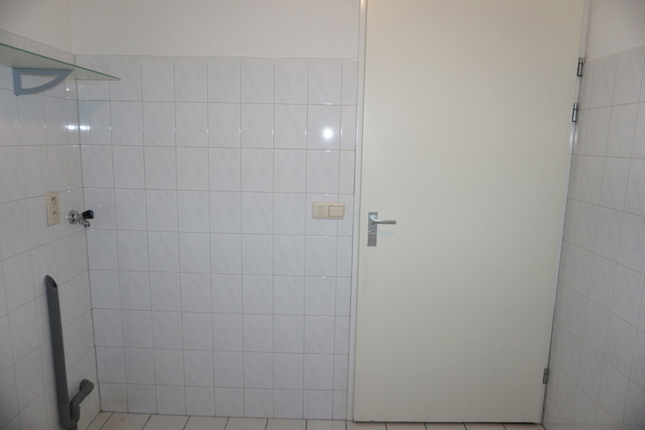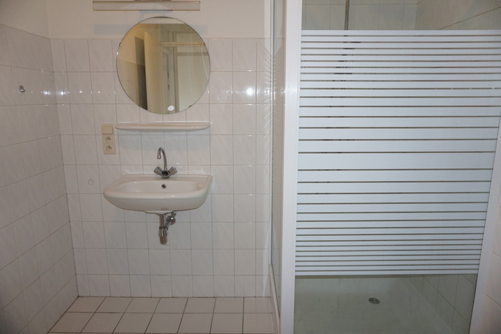 De ruime, grotendeels betegelde badkamer is voorzien van een douche met thermostaatkraan, een vaste wastafel met spiegel en planchet, de wasmachineaansluiting en de bediening van de mechanische ventilatie.